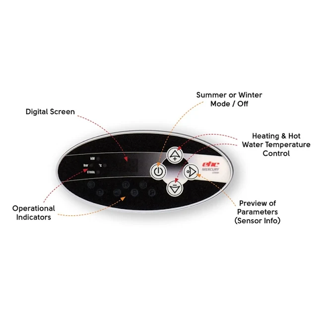 The Mercury Boiler outputs are 12kW amp; 14.4kW Single Phase, and 19kW amp; 26kW Three Phase. The operating temperatures of the boiler can be adjusted using the easy to use Digital Control Panel with adjustable temperature outputs ranging from 30°C-60°C (Hot Water) and 20°C-85°C (Central Heating).