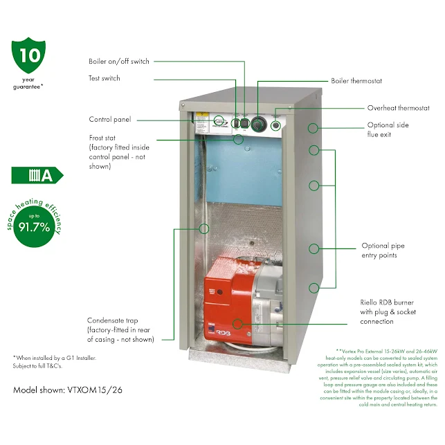 The Grant Vortex Pro External Oil Boiler is ideal if you need your boiler to be installed outdoors. It offers great performance and exceptional efficiency, being one of the highest-efficiency outdoor oil-fired boilers on the market.