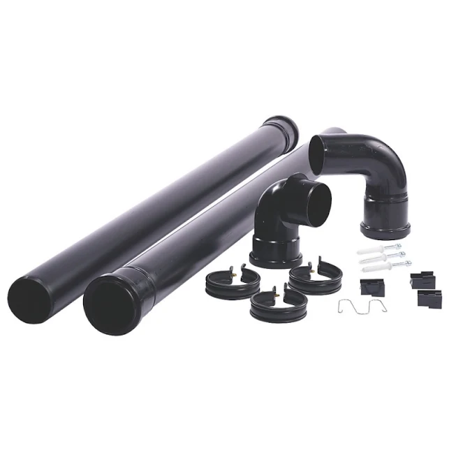 This 60mm plume management kit is suitable for Viessmann reduced height horizontal flue kits. The kit includes 2 x 1m x 60mm black single plume pipes and 2 x 90 degree elbows, one to connect to the horizontal flue kit and one for for the plume exhaust. Three fixing brackets also included.